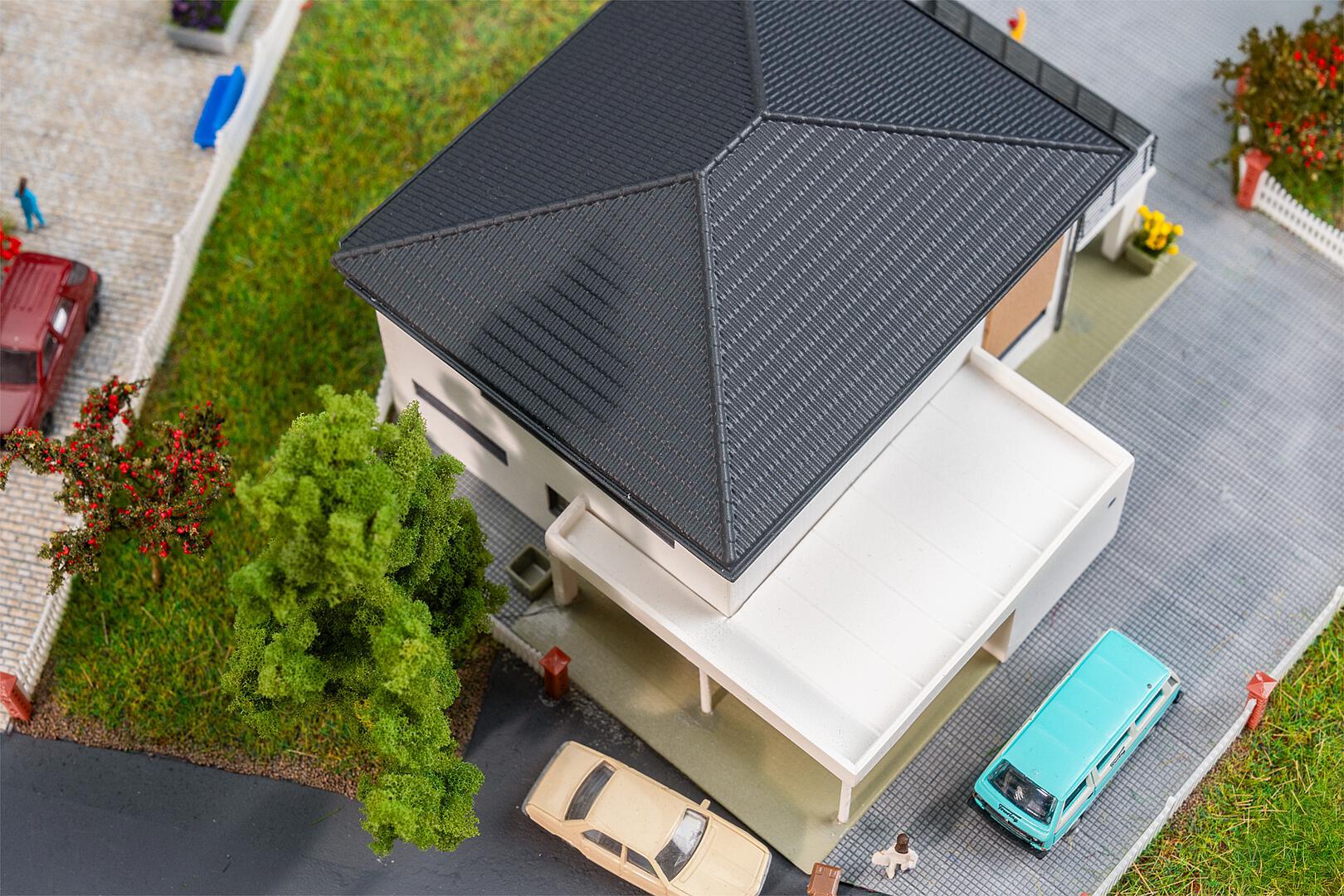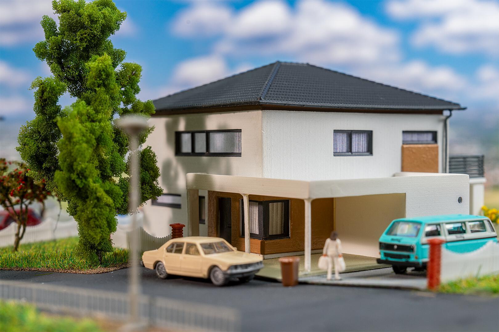 Modernes Stadtleben gefällig? Dieses Modell bringt frischen Wind in jede Vorstadt und verschönert die Modellbauanlage auf stilvolle Weise. Mit seinen weißen Wänden, dem Dach aus schwarzen Ziegeln, dem großzügigen Balkon sowie den eleganten Holzverzierungen und großen Fenstern im Erdgeschoss ist es ein echter Blickfang für Liebhaber zeitgenössischer Architektur.