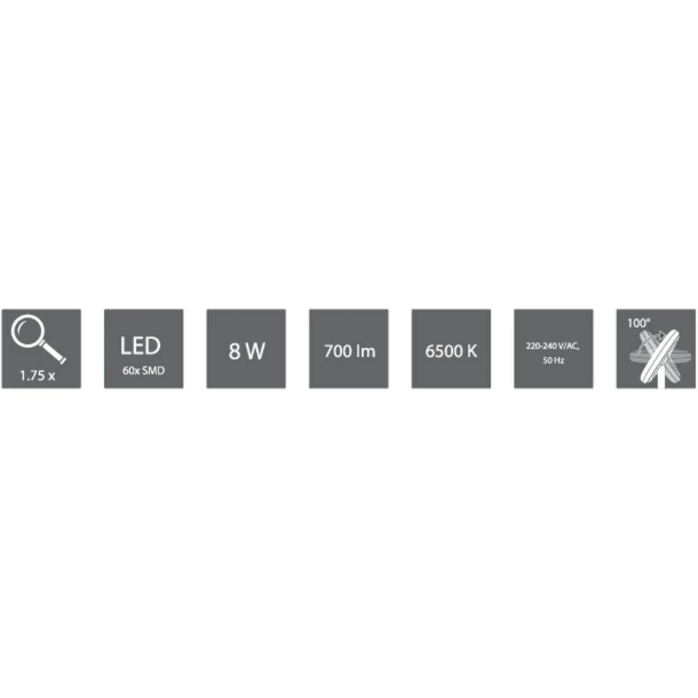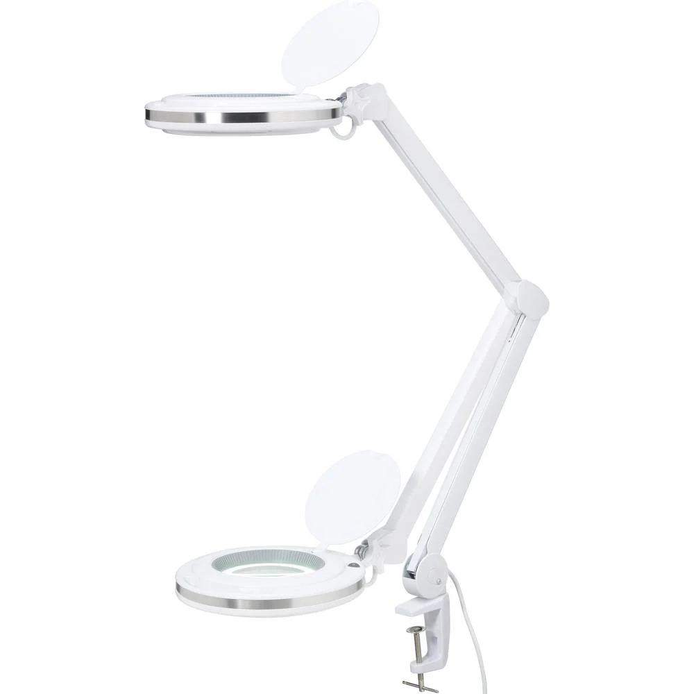 Leistungsstarke, stromsparende Lupenleuchte mit 60 SMD-LED's und eleganten Metall-Applikationen. Die qualitativ hochwertige Glaslinse mit 1.75-fachen Vergrößerung (3 Dioptrien) eignet sich ideal für filigrane Arbeiten. Der verstellbare Lupenarm sorgt für einen extra großen Arbeitsbereich. Robuste Metallkonstruktion mit Griff zum leichten Positionieren der Lampe.