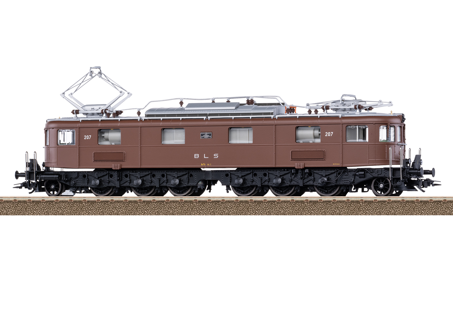 Elektrolokomotive Ae 6/8 der Bern-Lötschberg-Simplon Bahn (BLS). Lokomotive aus der 2. Bauserie. Dunkelbraune Grundfarbgebung mit schwarzem Fahrwerk. Ausführung im ursprünglichen Zustand mit 2 Pantographen und Bremswiderstände im Maschinenraum. Mit stirnseitigen Übergangsblechen und Falschfahrsignal. Signum-Integra Magnet am Lokende II. Längsseitig jeweils mit 4 Maschinenraum-Fenster und Lamellen-Lüftergitter. Lok-Betriebsnummer 207. Betriebszustand Ende 1940er-/Anfang 1950er-Jahre.