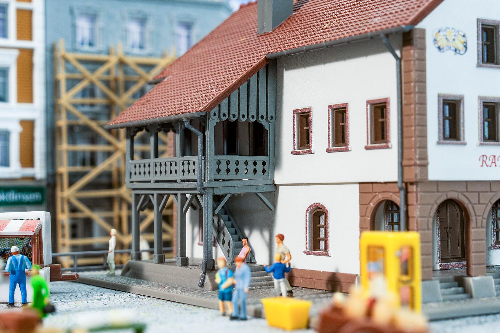 Das dreigeschossige Kleinstadtrathaus mit seinem markanten dritten Giebel, dem einladenden Arkadengang und dem seitlichen Balkon mit Treppenzugang ist ein wahrer Blickfang auf der Modellanlage! Der Bausatz umfasst zudem eine detailreiche Bodenplatte, einen Glockenturm und einen malerischen Brunnen. Damit lässt sich mühelos eine charmante Dorfszenerie kreieren!