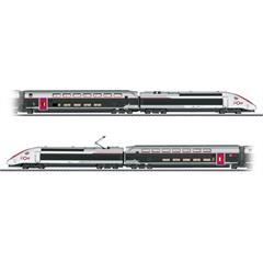 4-teilige Grundgarnitur. Beide Triebköpfe (M1 und M2) motorisiert. Mit Digital-Decoder mfx+ und umfangreichen Geräuschfunktionen. Geregelter Hochleistungsantrieb in beiden Triebköpfen, zentral eingebaut. Jeweils 4 Achsen über Kardan angetrieben. Haftreifen. Serienmäßig eingebaute Innenbeleuchtung. Fahrtrichtungsabhängig wechselndes Dreilicht-Spitzensignal, 2 rote Schlusslichter und Innenbeleuchtung konventionell in Betrieb, digital schaltbar. Drittes Spitzenlicht für französischen Lichtwechsel digital separat abschaltbar (Lichtfunktion). Beleuchtung mit wartungsfreien warmweißen und roten Leuchtdioden (LED). Mit Pufferspeicher. Führerstände in den Triebköpfen mit Inneneinrichtung. Separat angesetzte Griffstangen aus Metall. Triebkopf und Übergangswagen sind paarweise fest miteinander gekuppelt, mit Spezial-Kurzkupplungen und Kulissenführung. Zusätzliche Kulissenführung im Jakobs-Drehgestell. Fahrtrichtungsabhängige Stromversorgung über den jeweils vorderen Triebkopf. Innenbeleuchtung wird versorgt über die durchgehende elektrische Verbindung des ganzen Zuges. Jeder Triebkopf mit 2 Einholm-Stromabnehmer in unterschiedlichen Ausführungen mit jeweils einer Wippe für DB und SNCF. Stromabnehmer sind nur mechanisch, nicht elektrisch funktionsfähig. Maßstäbliche Nachbildung, daher befahrbarer Gleisbogen ab Mindestradius 360 mm bei freiem Lichtraum.